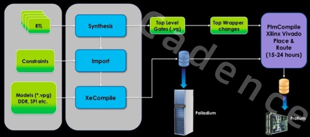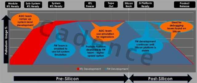 蓝色阴影区代表了固件开发,开始时会使用 Palladium,当设计足够稳定后就会转用 Protium。Protium 的优势是具有比 Palladium 更快的软件运行速度;不足则是由于 FPGA 布局布线耗时较多,需要相对多些时间来准备版本。