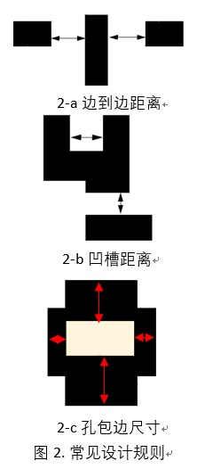 影响管脚接线的设计规则主要有: 金属线与金属线之间的距离,金属端头之间的距离,过孔被金属层覆盖的面积,跨层金属之间的距离,等等。图2a~c是一些常见的设计规则。