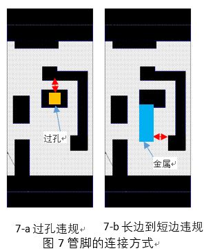 连通性问题通常是由不合理的管脚形状引起。如图7-a所示, 在使用过孔连接中间位置的管脚时,过孔会触发过孔和相邻金属之间的设计规则。在使用金属线连接中间位置的管脚时, 如图7-b所示,则会触发金属线和金属线之间的设计规则。