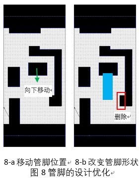 对上面这个管脚设计,有两种改进方案,一种是把中间的这个管脚往下移动,或者增大管脚面积,这样在用过孔连接管脚的时候,可以把过孔向下方挪动一些,以避免触发过孔和金属线之间的设计规则,如果8-a所示。或者如图8-b所示,把相邻的管脚剪除一些,这个管脚往下引线的时候,可以避开金属线端头和金属线之间的设计规则,同时这条引线可以和相邻的金属线保持一点距离,允许使用过孔往高层跳线。