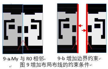 如果管脚的连通性问题是由于两个标准单元摆放在一起引起的,同时受限于版图空间的限制,管脚的形状无法改变。这时我们采用增加布局布线约束的方法来阻止这种场景出现。如图9-a所示,两个标准芯片单元相邻放在一起,中间两个短的管脚无法被连接。通过增加布局布线的约束,在标准单元的边界上增加约束条件,在布局的时候,不允许这两个标准单元的边界放在一起,从而留出大的空间来连接这两个短的管脚。