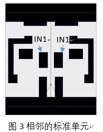 在实际应用中,标准芯片单元有可能是紧挨着放在一起,这时候两个单元的管脚就会相互影响。版图工程师很能考虑这种情形,因为很难预测到那些标准芯片单元会被放在一起。图3是两个标准芯片单元放在一起的场景。两个输入端管脚离得很近,而且都需要引出,引出线之间很容易触发设计规则,如果预留的空间不足,就有可能造成管脚无法引出的情况。