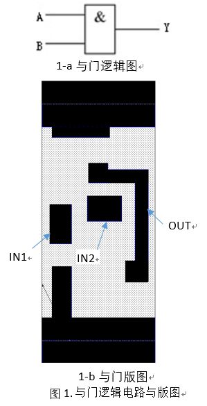 标准芯片单元的管脚形状和排列布局会影响芯片的可连通性。在标准芯片单元库中,与门是一种使用最频繁的标准单元。图1-a是与门的逻辑电路图,有两个输入管脚和一个输出管脚。在标准芯片单元的版图上,对应的也有两块金属用于输入端的连接, 一块金属用于输出端的连接,如图1-b。