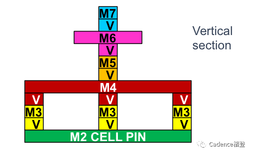 N7 的新特性之一是通孔支柱(via pillar),层间互联时无需在每层布一小段线路。理论上,各通孔(via)可以无限堆栈;但现有技术条件下,因为最底层架构的电流负载有限,所以仍需多个通孔。一般情况下,通孔支柱的使用环境比较受限;并且,通孔支柱通常与单元库引脚相连,意味着每个单元都会在输出端有一个通孔支柱。通孔支柱的横截面如图所示。