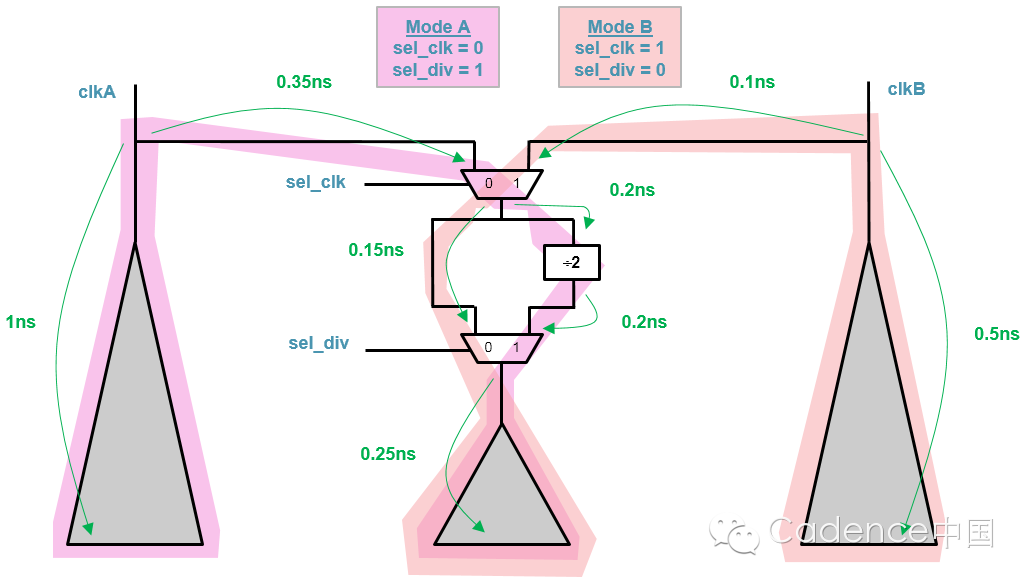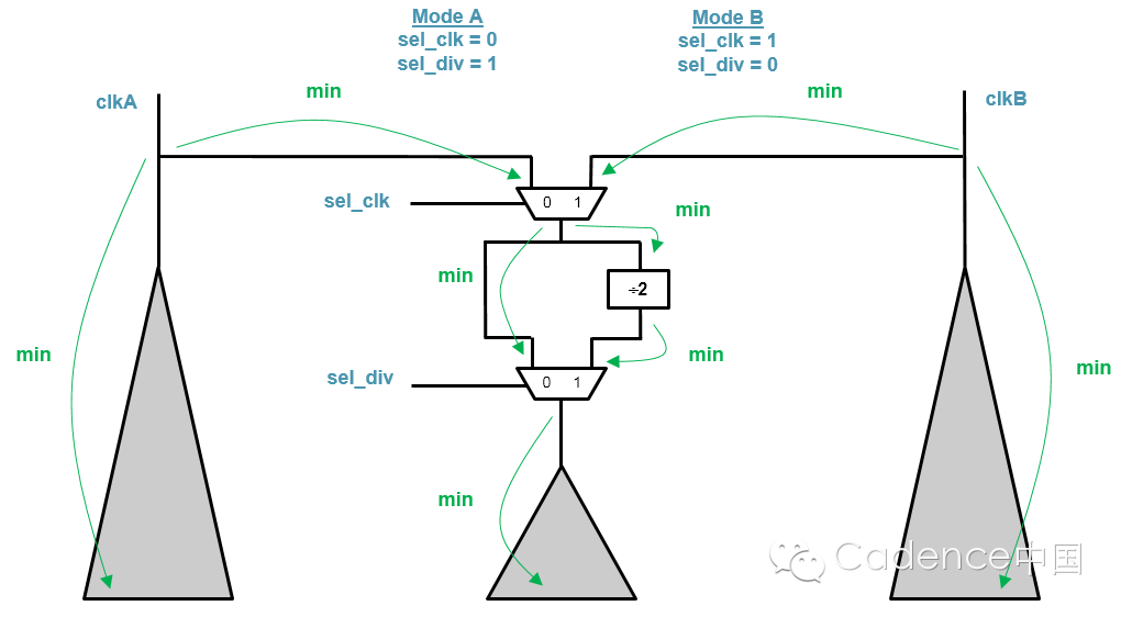 区别于传统CTS工具,Cadence EDI 14.20 (Oct. 2014)采用全新的CTS引擎——iCTS。iCTS是一种基于图表结构的CTS策略,又称“Graph-basedCTS”。这种CTS策略可以让基于MMMC下的SDC得到精确理解。每一种SDC模式的时钟树都被转化为一个新的“skew group”,而这个skewgroup将包含此模式下的所有时钟叶节点。当时钟树结构存在上述重汇聚和堆叠的情况时,同一个时钟树将在不同的模式下追溯得到不同的时钟节点,从而产生不同的skew group定义。