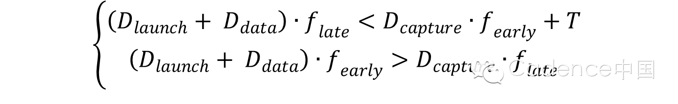 随着半导体制造工艺地不断演进,更多的功能模块被引入SoC中,系统设计复杂度不断地提高。而在多模式多端角(MMMC)下,OCV的影响逐渐成为时钟树设计的难题。以一条简单的时序路径为例,我们可以迅速写出一组简单的方程组来展示建立时间与保持时间的关系,如下所示.