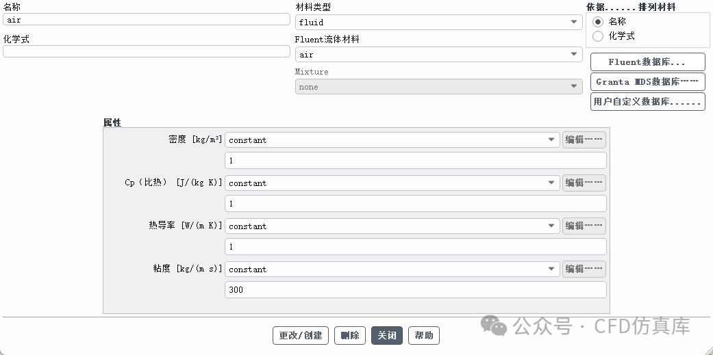 此处对材料进行设置,依据相关文献,进行材料参数的设置,该材料的密度为1开关/m^3,比热为1、热导率为1、粘度为300,具体设置如下图所示: