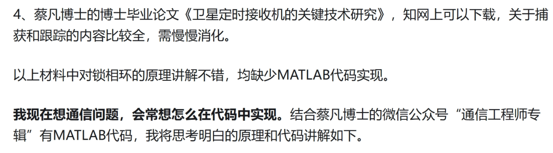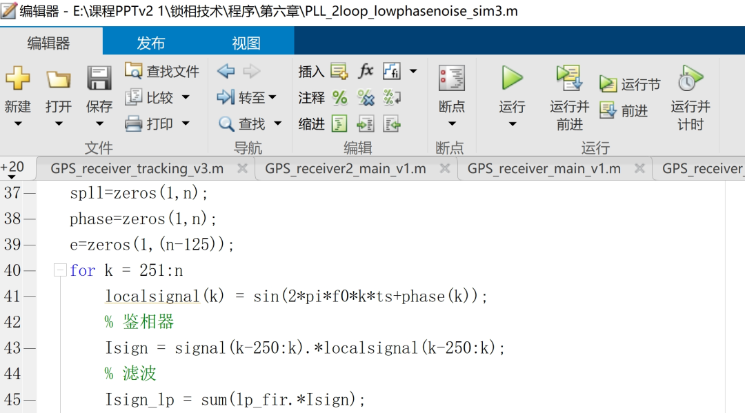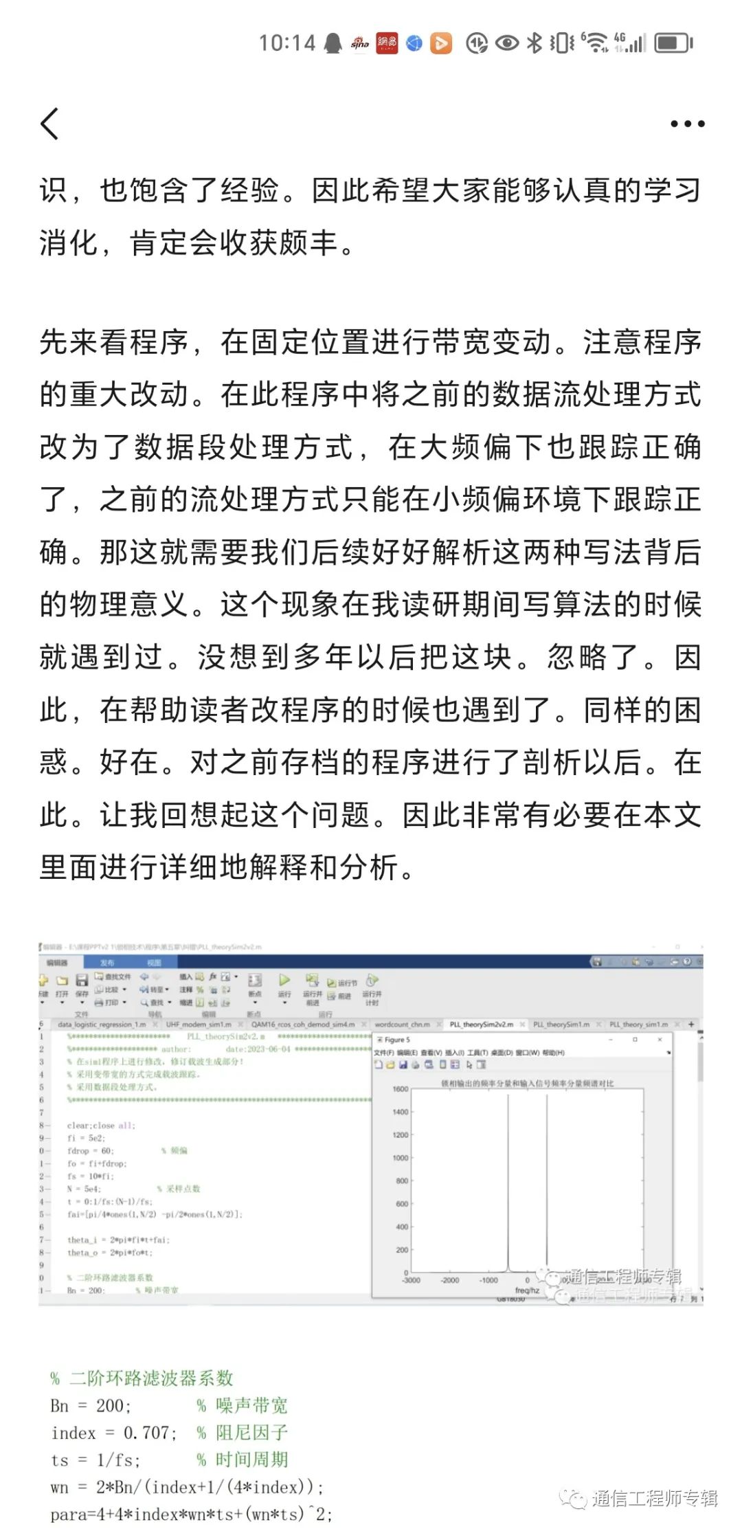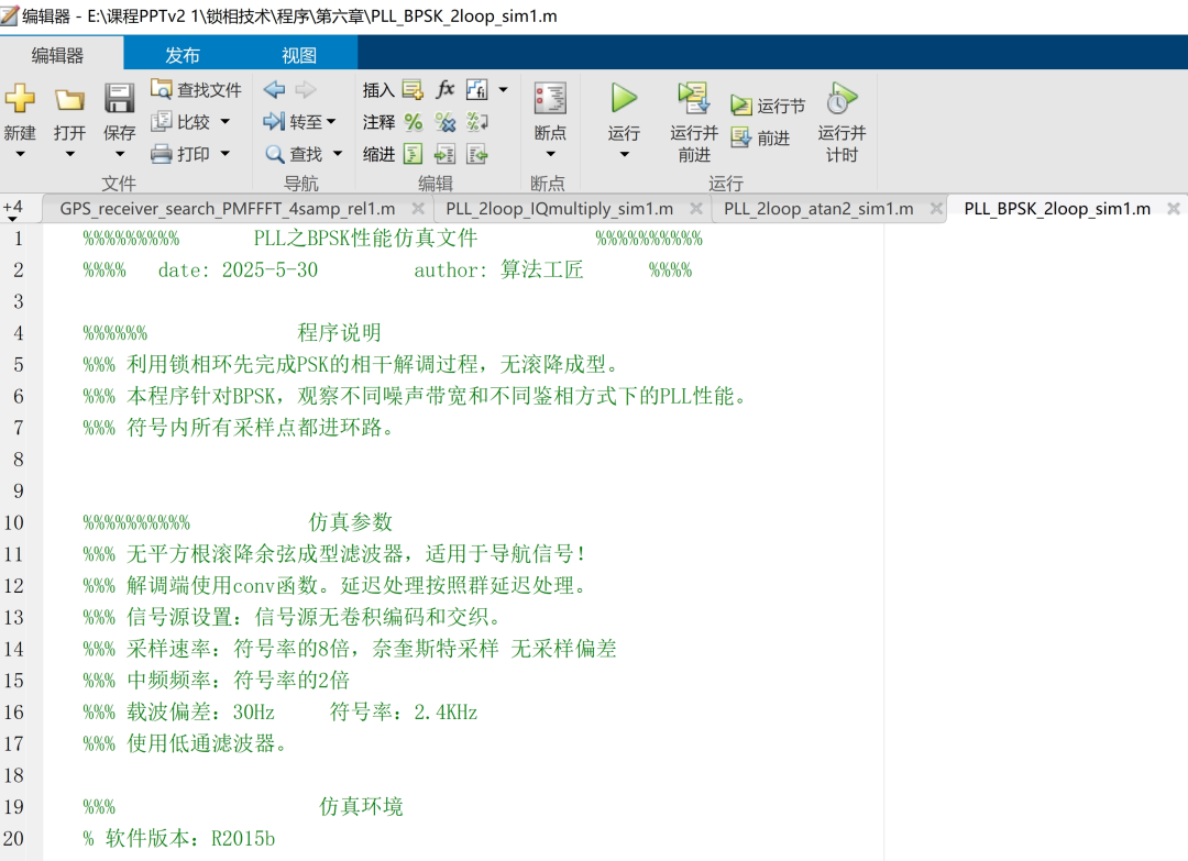首先文章中的一些文字需要修正一下,其次本文会继续抓住文中提到的问题穷追不舍!!!之前的断句不合理,不过相信读者能顺懂!两种方式下怎么就带来了频偏捕获范围的差异呢?图片文字中提及的问题指的就是这个!!!鉴相器的差别不就是段处理和流处理吗?怎么就造成了频偏捕获的差异了?到底是不是鉴相器造成的呢?笔者带着读者进行一步一步的深入分析!当年的我为此也困惑了好久,怎么段处理的捕获性能就会差一些呢?是什么原因造成的呢?在第14篇文章中改版了程序,清晰的指出了段处理和流处理的差异,利用仿真结果来支撑说明过程!两种处理方式没有在捕获范围上造成差异!!!不过不同的鉴相器确实会造成一些性能的差异,上一篇文章已经给出了仿真验证。本文将重点通过对调制信号进行不同鉴相器的锁定测试来显示差异,这是上一篇文章的延续,因为本文的调制信号是BPSK信号,就是卫星导航中常用的调制方式。文章中详细的记录了仿真的深化过程,对专业领域初学者帮助非常大。一步一步的讲解非常好篇幅,请读者耐心看完,本文超过三千字,长度堪比一篇本科毕业论文,还包含大量仿真代码,读者在学习理论的同时也需要在电脑中复现程序,这样才能真正感知理论知识的实用过程。这个系列的后续文章的发布间隔会超过六个月,主要由于本人精力严重不济,最近“三阳”之后,腰部不适加重,再加上睡眠质量差,因此写作周期不得不加长,敬请大家谅解。由于本文时间跨度长,有些代码存在遗忘现象,特地录制视频讲解,方便后续查找和使用。即使是老“码农”,如果时间太久没碰代码,也会手生。那么在校学生如果想以后靠编程吃饭,那就更要多“动手”,没有实践哪来“熟练”,没有“熟练”哪来“积累”!多学点,找工作时自然“硬气”!!!这里的鉴相器就是乘法运算。单路的乘法(只有I支路)!那换一种方式会如何呢?比如使用atan2运算方式。本人在下面的文章中做了完整的比对测试!这是针对正弦波做信号源的测试,那么对于BPSK信号,这两种鉴相算法 会带来什么差异呢?口说无凭,需要仿真验证差异!后面会展示三个大程序,每个程序里面会包含多个鉴相器算法,务必请大家跟着仿真一遍,才能直观的知晓差异和性能!!!来源于本人博士论文《卫星定时接收机的关键技术研究》那就一起来看表中的1、2、4栏鉴相器的环路性能。多个鉴相器的仿真合在了一个仿真程序中了!先看程序PLL_BPSK_2loop_sim1。本人习惯仿真阶段的程序以sim结尾,等完善后以rel结尾。为方便仿真,早期没有加入采样偏差,但大家一定要有这方面的概念,这是造成位滑动的主因!!!