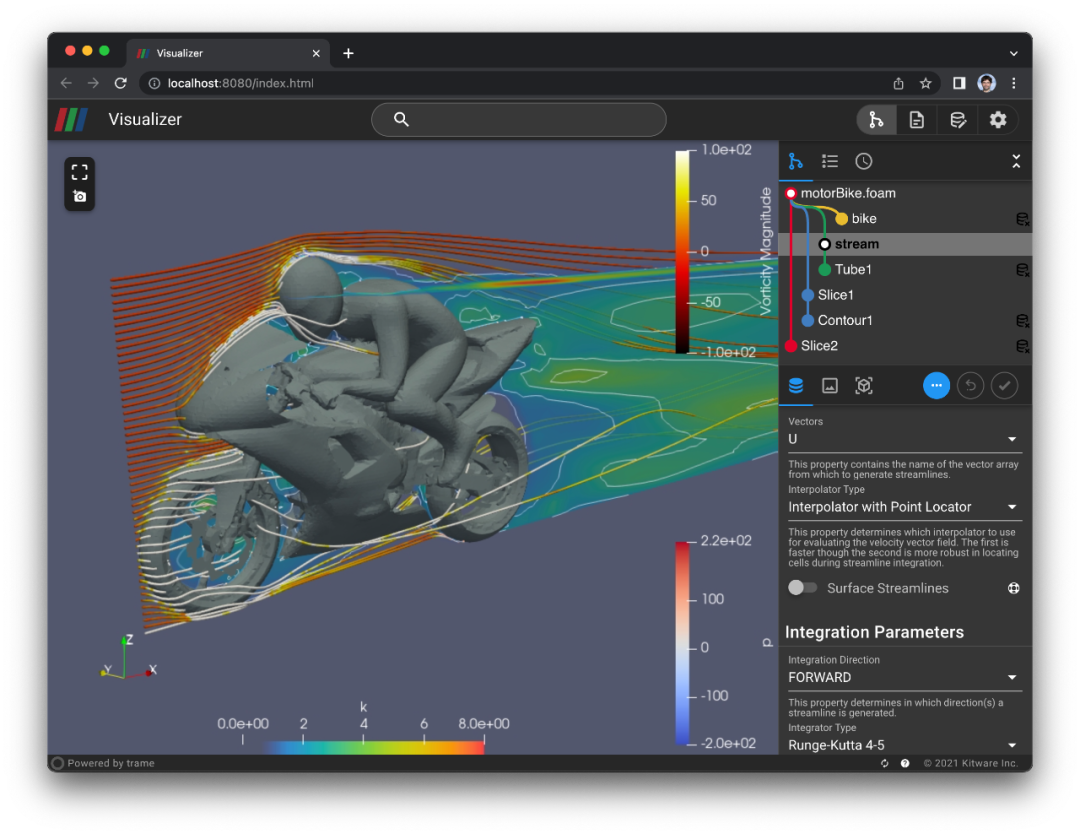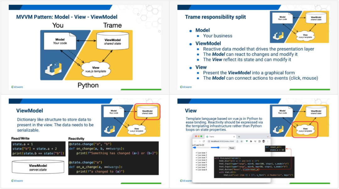 Trame 是一个易于使用的基于 Python 的开源框架,它允许您创建类似于桌面应用程序的体验,并在网络浏览器中展示。 您可以使用它来创建按钮、对话框、利用 VTK/ParaView 的 3D 场景、图表、地图等等。