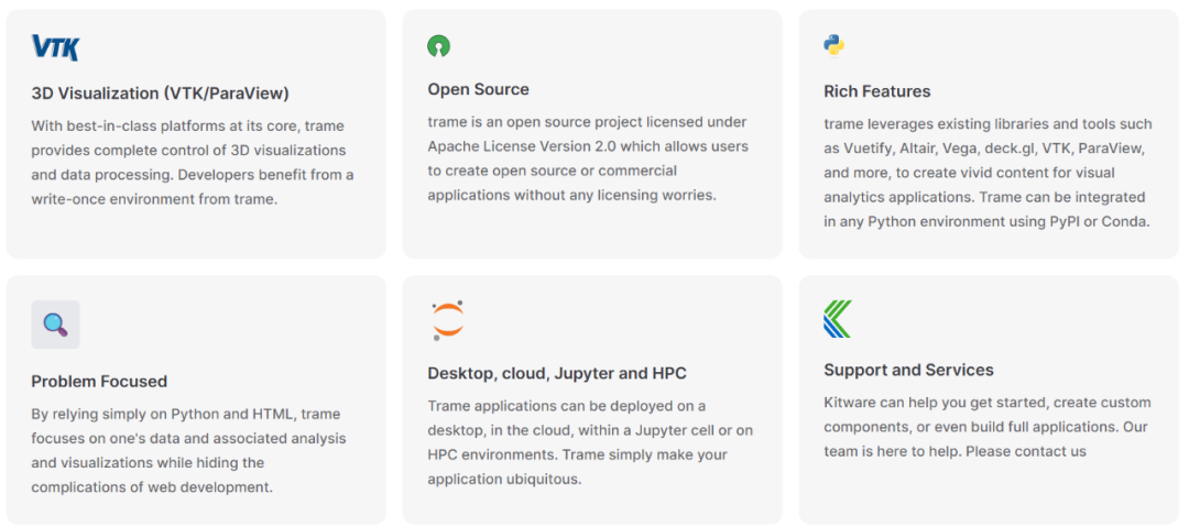 Trame 可作为 PyPI 包获取,也支持 conda-forge,还提供了用于云部署的 Docker 镜像。