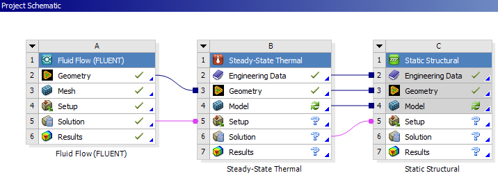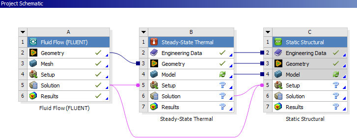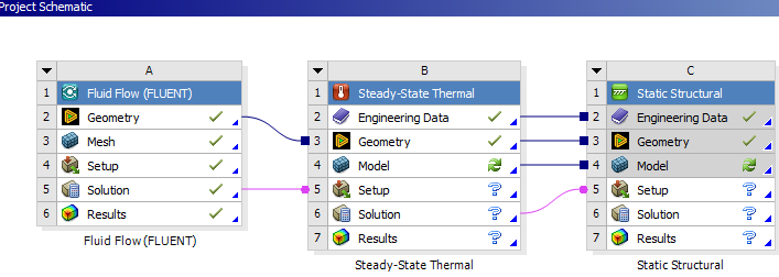 - 将Fluent的A5单元链接到MEchanical的C5单元,操作后,来自Fluent的流体压力和来自Thermal模块的固体温度都将作为载荷出现在Mechanical