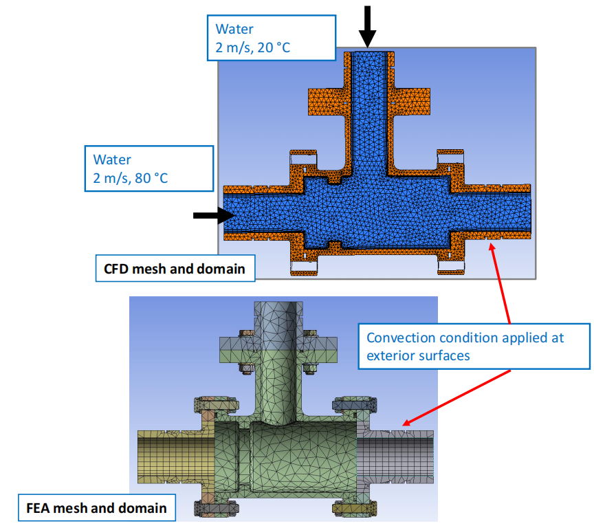 T形管内部,冷热流体流动混合,计算固体承受的热负荷,并且同时考虑流动压力。