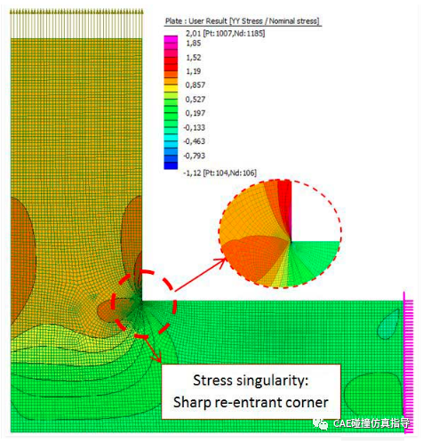 由上述公式可知,如果力的作用面积趋于0,则对应的应力会趋于无穷,这个就是有限元发生奇异的本质原因,即在有限元计算中,如果存在力的作用面积趋于0,则该位置即为应力奇异位置。