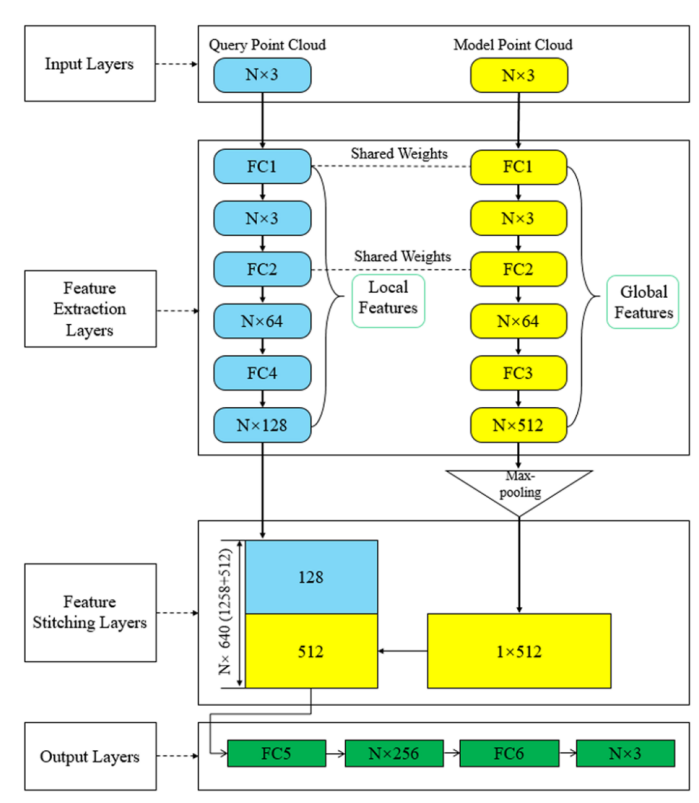 图1深度学习网络构建。网络以三维空间分量为x、y、z(对于压力,三分量值相同)的N个点作为输入。 通过特征提取和拼接层处理,引入空间关系,提取和再现模型几何与血流动力学之间的关系。 Maxpooling层解决了点云的无序性。 网络的输出是相应查询点云中N个点的血流动力学三维空间分量。