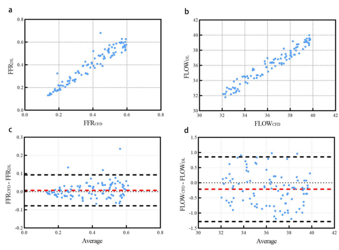 图4 CFD和深度学习得到的FFR和改善血流量的比较。 a是CFD (FFRCFD)和深度学习(FFRDL)的FFR值的散点图。 b是CFD (FLOWCFD)和深度学习(FLOWDL)改善的血流量值的散点图。 c、d为对应(a、b)的Bland-Altman分析图。 用于计算FFR和改善血流量的血流动力学结果来自测试集中的100个心血管模型。