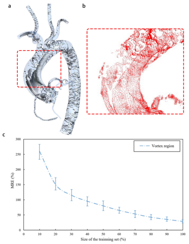 图5预测误差分析。以术前测试集中的某模型为样本,a为其CFD模拟流场中的涡区,涡区主要分布在主动脉和主动脉上支,而不是移植物和冠状动脉。 与整个模型相比,移植物和冠状动脉漩涡区的点数仅占所有查询点的0.1%。 大多数模型在红框圈出的升主动脉区域存在明显的漩涡区。 为了清晰地表示高预测误差点(MRE > 10%)的分布,b表示与(a)相同模型的深度学习预测速度场中高误差点(圈内区域)。 这些点的分布与(a)中的涡流区高度一致,证明误差主要来自主动脉和主动脉上支的涡流区。 c表示仅在涡旋区域内随训练集大小不同的预测误差。 c表示训练集大小对涡区MRE的影响。 我们固定了测试集,并将训练集的大小从10%增加到100%。 然后计算并观测了涡旋区的MRE。 当训练集的大小达到100%时,MRE仍然呈下降趋势。 最小值28.53%仍远高于主动脉及主动脉上支MRE(9.74±3.83%),如表1所示。 进一步证实了预测误差的来源,并表明有必要增加训练集的规模。