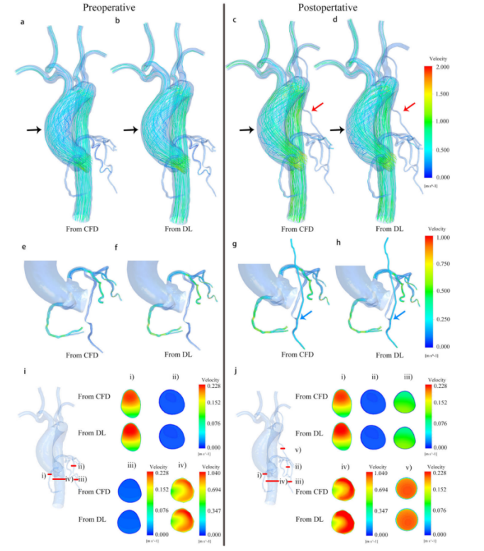 图2使用狭窄率为85%的样本,CFD和深度学习(DL)方法的速度场比较。 a-d为通过CFD和DL得到的CABG前后整个心血管内部流场流线图。 a-d中黑色箭头所示位置为升主动脉漩涡区。 c、d中红色箭头所示位置为移植物。 e-h冠状动脉和移植物流场流线型图。 冠状动脉内的血流速度小于主动脉内的血流速度,这意味着在相同的速度色条下,很难清晰地显示冠状动脉内的流场分布。 因此,冠状动脉流场单独显示。 g-h中蓝色箭头所示的位置是移植物与LAD之间的连接部位。 i, j为速度分布的截面图,分别来自(i): RA分支; (ii)狭窄前LAD近端; (iii)狭窄后的LAD远端; (iv):降主动脉; (v):贪 污。 (v)能反映接枝内的层流。 对比结果证实了两种方法得到的速度场具有较高的一致性。 这清楚地显示了CABG手术对整个心血管系统流场分布的影响。