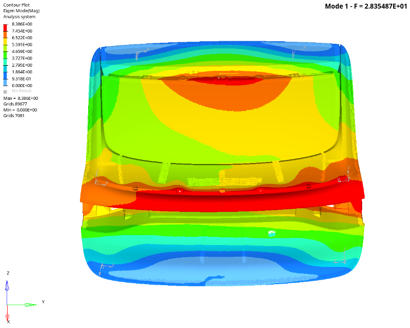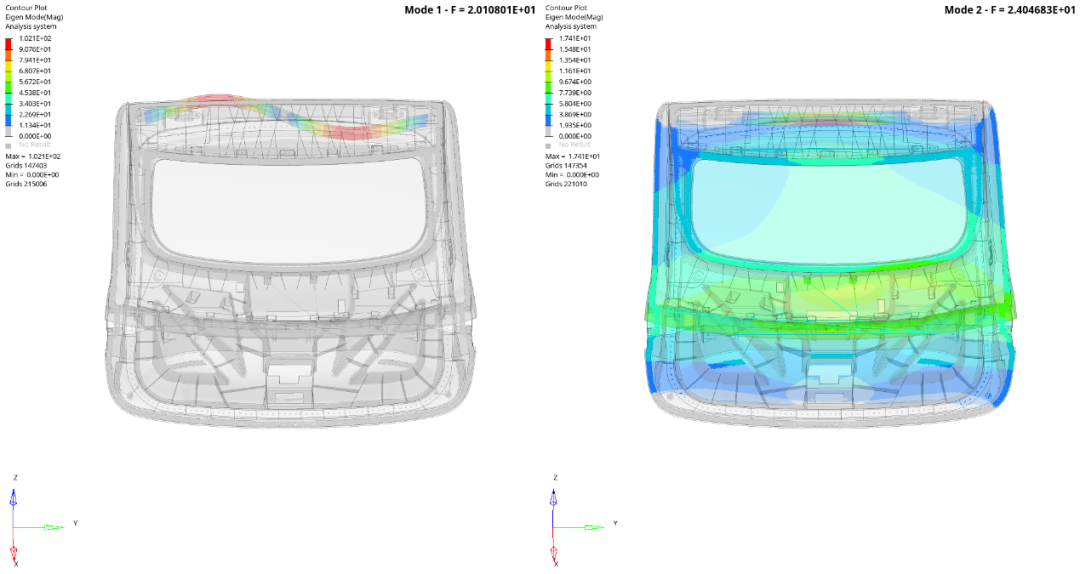 通过运用Altair OptiStruct求解器对汽车塑料尾门进行模态分析及优化,并与试验对标,取得以下成果: