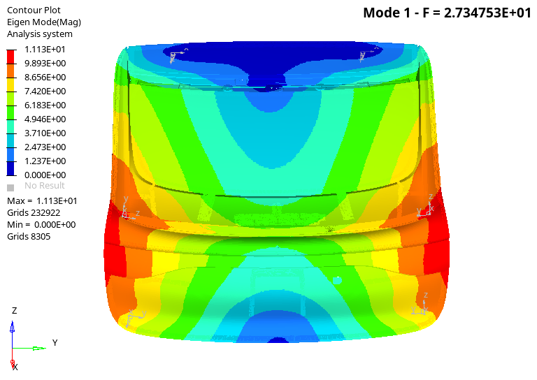 由图9可知,一阶模态为全局模态,值为27.4Hz,高于目标值≥27Hz,满足要求。