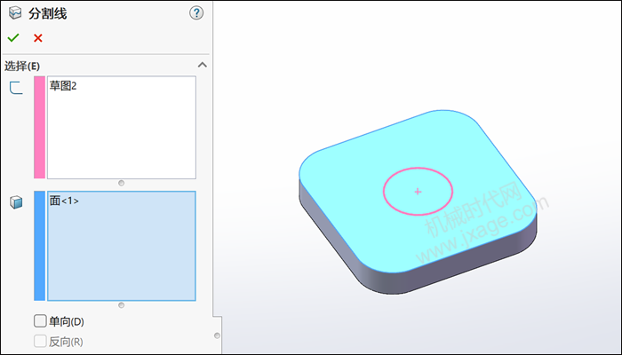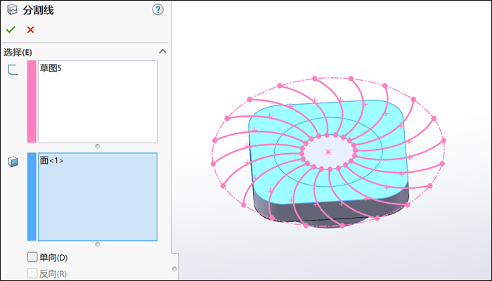 4.点击分割线,要分割的曲面选择下图所示的蓝色面,使用上一步创建的草图进行分割,点击勾号完成。