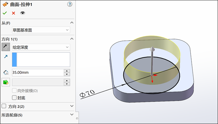 6.点击“插入”-“曲面”-“拉伸曲面”,选择上一步创建的草图作为拉伸截面,设置拉伸深度值为35mm,如下图所示,点击勾号完成。
