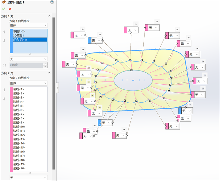 12.点击“插入”-“曲面”-“边界曲面”,选择下图所示的3条蓝色曲线作为方向1曲线感应,选择下图所示的20条粉红色曲线作为方向2曲线感应,如下图所示。