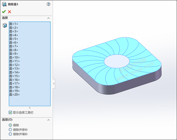 13.点击“插入”-“面”-“删除面”,选择下图蓝色的20个面,选项选择“删除”,如下图所示。
