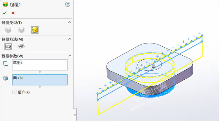 3)包覆参数下的包覆草图的面,选择下图蓝色的面,包覆草图选择草图4,如下图所示。