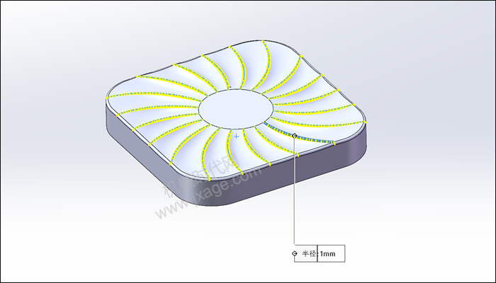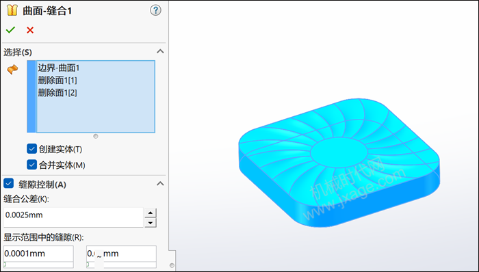 14.点击“插入”-“曲面”-“缝合曲面”,将下图所示的所有曲面进行缝合,如下图所示。