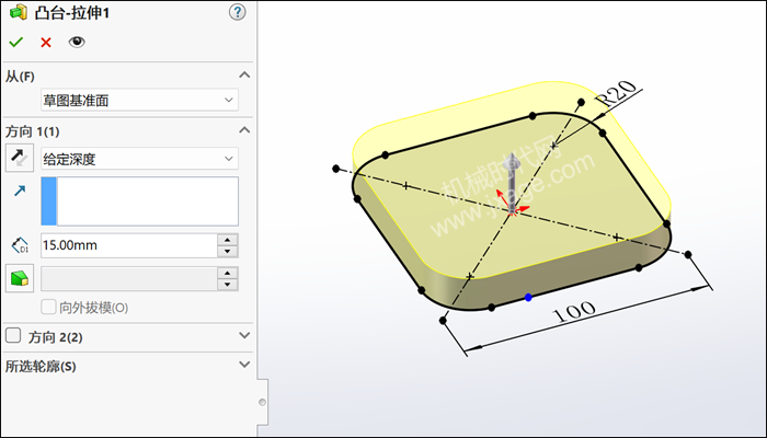 2.点击拉伸,选择上一步创建的草图作为拉伸截面,设置拉伸深度为15mm,点击勾号完成。