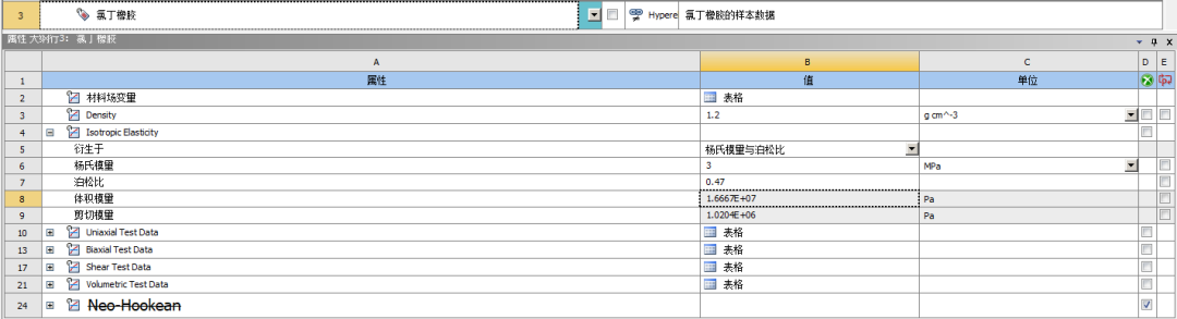 选择该材料后,系统会自动填充相关的材料属性,包括密度、弹性模量和泊松比等。