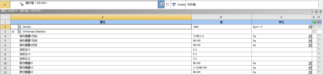 选择该材料后,系统会自动填充相关的材料属性,包括密度、弹性模量和泊松比等,由于碳纤维是各项异性材料,所以其弹性模量和泊松比如下图所示。