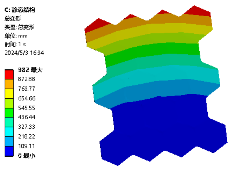 最大变形云图如下所示,可以看到最大变形为982mm。