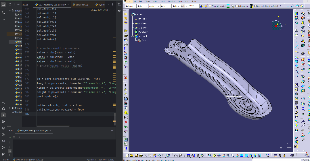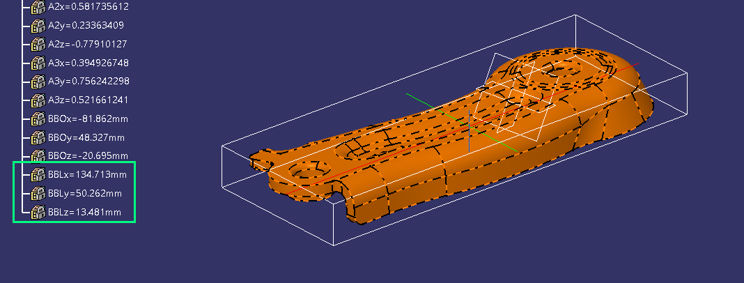 这是一个不管从xyz哪个正方向看过去,都很歪的零件👇它可以根据零件的几何形状,自动计算出最合适的轴系来生成包围盒👇首先,关于包围盒这个话题,小狼之前已经发过两篇文章,分别通过求极值点,以及用两个足够远的平面去“夹”的方式来自动计算但这两篇文章中的例子,作为思路参考,仅做了在绝对坐标系下测量的功能。事实上,我们完全可以修改上面的代码,像自带的Rough Stock命令那样,为每个零件指定测量长宽高的轴系。但问题又来了,指定轴系,要么手动用鼠标点击交互选择,要么为每个待测量的零件提前建好轴系。而无论哪种,似乎都违背了“二次开发是为了提高效率,减少工作量”这一初衷。直到最近AI工具的广泛应用,小狼发现很多自己之前不了解的领域、算法等,都可以通过AI辅助来给出。这不,我们前段时间还发了这一一篇文章:它可以根据零件的外形特征,自动计算出正确的投图方向,从而让自动出图这件事变得更智能。基于同样的道理,我们可以用同样的算法:先根据零件的顶点信息,通过numpy中的算法实现PCA计算,最终求出一个“适合”的轴系信息;大家可能还用到过这个Inertia的测量工具,它也可以生成一个随形的轴系和框。我们同样可以用代码获取到这个惯性张量特征向量信息,进而构建一个轴系。以上两个方式构建的轴系稍有不同,但结果十分接近。因为对于一个外形不规则的零件,怎样叫“摆正”本来就不好定义。 但不管用哪种方法,我们都得到了这个customized的轴系,从而让了让零件在这个轴系下处于“摆正”的姿态。这时,就可以参考前文的思路,计算零件在这个轴系的xyz方向下的极值点,即可实现我们文章开头的,自动创建一个自适应的“包围盒”的效果。