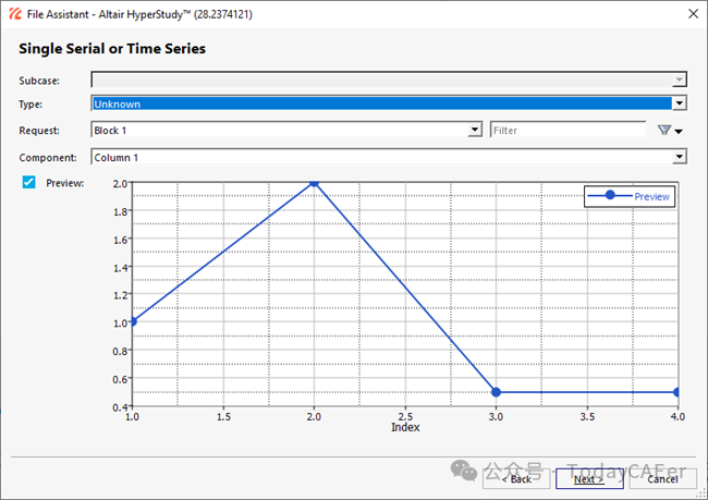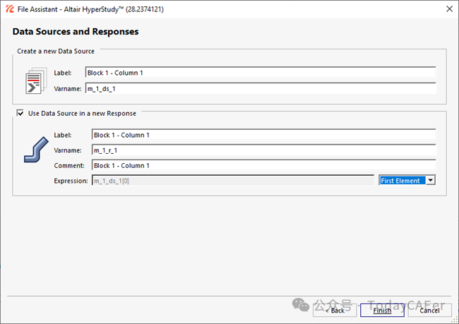 1.转到Define Output Responses步骤。a)从目录中,将位于approaches/setup_1-def/run__00001/m_1 中的.res文件拖放到工作区中。b)在File Assistant对话框中,将Reading技术设置为Altair® HyperWorks®,然后单击Next。c)选择Single Item in a Time Series,然后单击Next。e)Optional:输入数据源和输出响应的标签。Note:因为这个数据源中只有一个值,所以[0]输入到m_1_ds_1 之后,从而选择数据源中的第一个(也是唯一一个)条目。 Output response 1 将添加到工作区。4.在Response 2 的Expression字段中,通过在m_1_ds_2后将[0] 更改为[1]来选择第二个值。继续进行所需的研究类型:DOE、Optimization、of Stochastic研究。