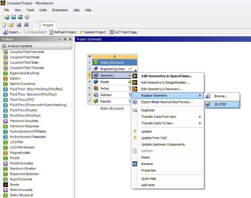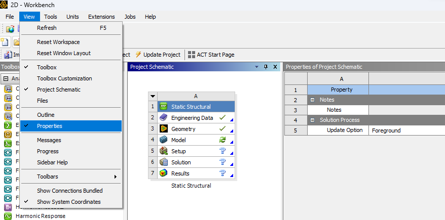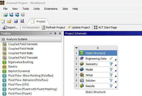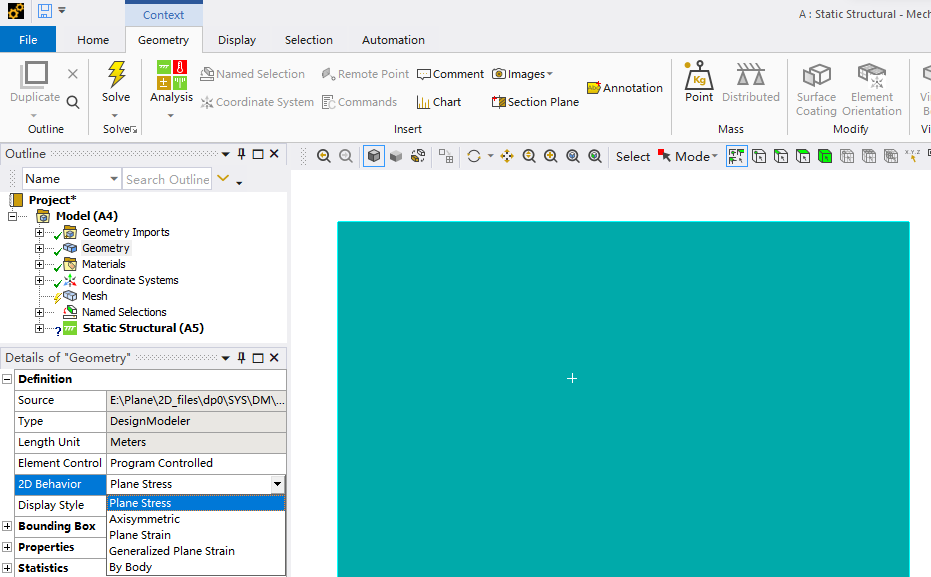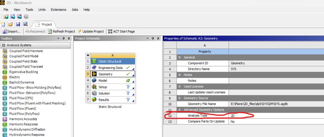 3)先激活2D分析类型,然后才能进入Mechanical,否则还是3D分析,并且不能再进行2D激活。一旦激活2D,则不可再把2D分析改成3D分析。