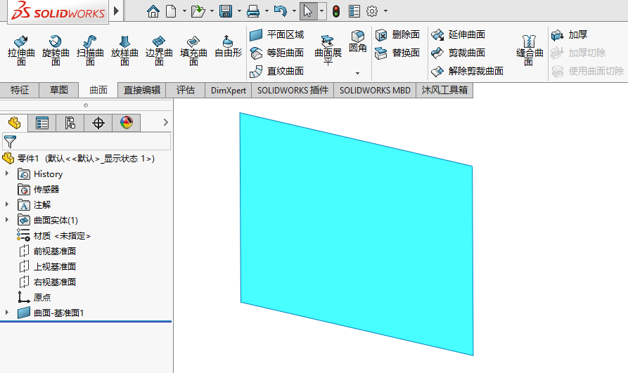 首先,采用Solidworks的曲面建模功能构建一个2D平面,如图1所示。点击前视基准面,绘制一个矩形草图—>插入—>曲面—>平面区域。