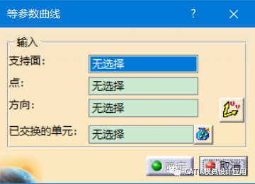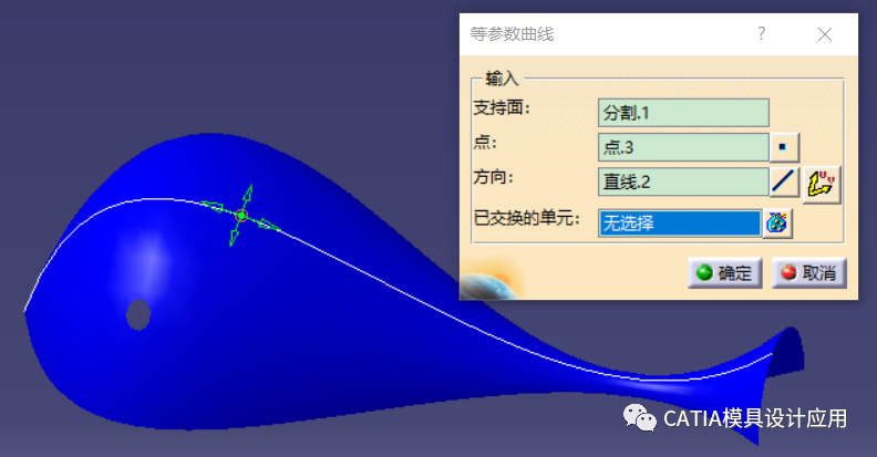 在曲面上移动,随着光标的移动,会预览通过这条线的等参数曲线,单击后,对话框自动录入点和直线,如下图所示,可以通过按住绿色箭头位置,可以移动点所在的位置,通过方向右侧的交换曲线方向按钮,可以切换UV方向。