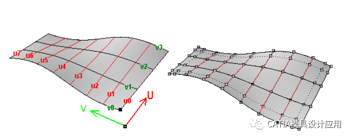 其实我们可以切换到CATIA的自由曲面模块。我们可以使用控制点命令,切换显示模式,看到曲面上的UV线构成,如下图所示。