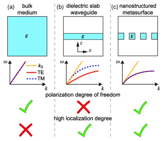 偏振自由度是各向同性均匀介质中平面波传播的固有特性。光学系统的小型化虽然实现了电磁波的高局域化,但也导致了偏振控制的丧失,即打破了TE-TM偏振简并。有研究发现,在介电超表面中传播的高局域化引导波具有近场偏振自由度。为利用局域光偏振自由度的平面偏振器件提供了新的平台。