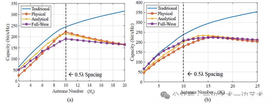 从结果中可以看出,传统归一化方法在容量评估中存在显著误差,尤其是在处理稠密阵列和立体阵列时,其局限性更加突出。这种方法既无法准确刻画天线阵列的增益极限,也无法反映天线间耦合效应导致的效率损失,从而导致容量评估结果偏离实际物理场景。