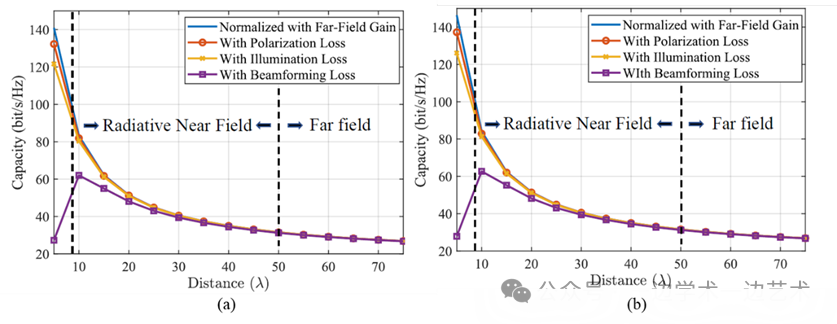 图5. 考虑不同类型增益损失的近场信道容量。(a)平面阵;(b)立体阵。