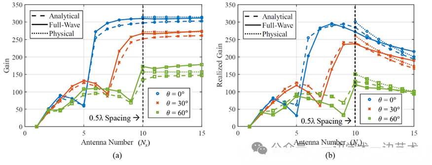 图2. 基于解析方法、物理方法和全波仿真的均匀平面阵增益。(a)增益;(b)可实现增益。