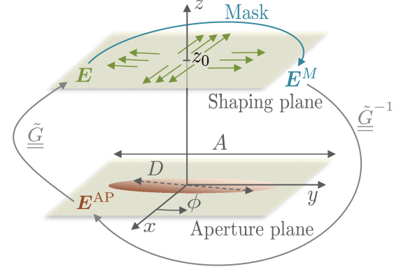 计算孔径分布EAP辐射的近场E开始,在近场平面上应用掩模(Mask),限制场强分布(如波束位置、旁瓣电平)。将修正后的近场反向映射为新的孔径场分布,迭代至收敛。通过圆柱坐标系转换,使EΦ=0,实现波束的极化分离(如不同波束对应不同径向极化方向)。结合交替投影法与极化约束,灵活生成复杂近场分布。