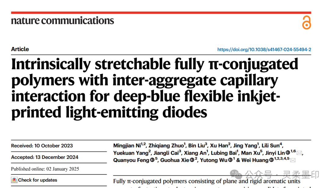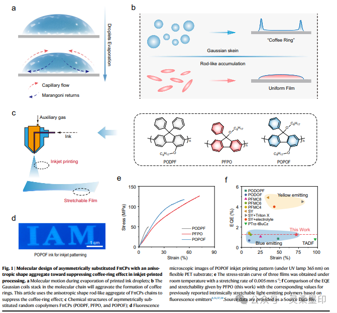 传统的全 π 共轭聚合物(FπCPs)虽然具有出色的光电性能,是打印和柔性光电器件的理想候选材料,但在实际应用中却面临诸多难题。其分子链间存在强烈的面对面 π - π 相互作用,容易自组装成刚性且易碎的半结晶结构,这使得前驱体墨水的链间缠结弱、粘度低。在喷墨打印过程中,这种特性会导致咖啡环效应,使打印薄膜沉积不均匀,影响图案分辨率和平板显示器的光电性能。而且,咖啡环效应还会改变多链激发物种的复杂光物理过程,降低深蓝色 PLEDs 的色纯度和发光效率。