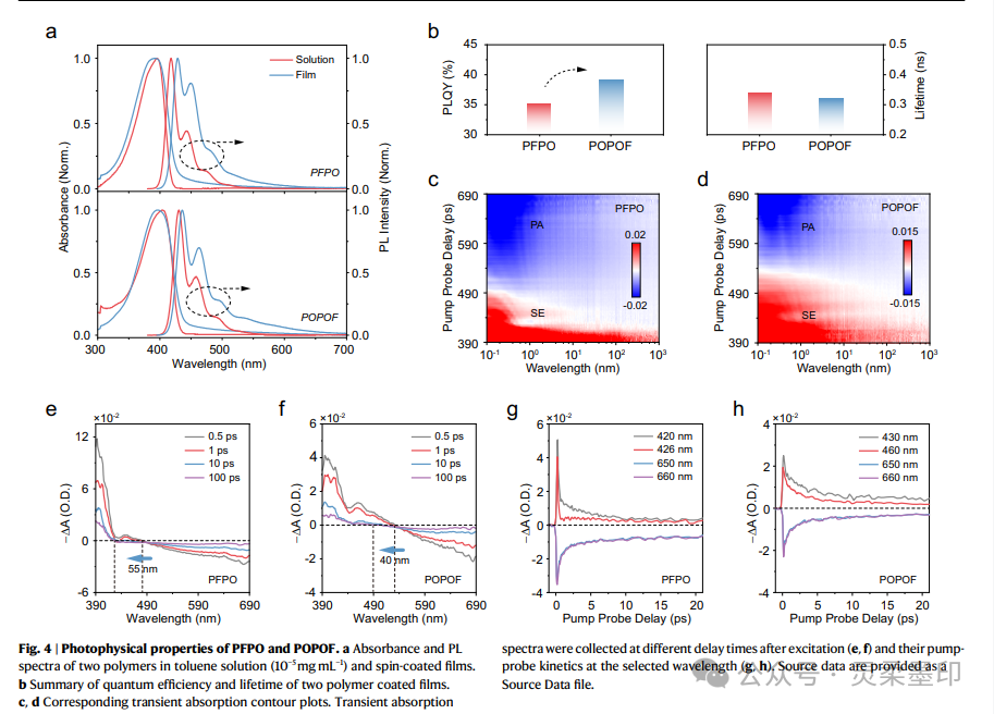 通过表征薄膜的量子效率和寿命,发现 POPOF 的量子效率更高,辐射跃迁速率也更高。瞬态吸收光谱研究表明,PFPO 和 POPOF 都有明显的受激发射和激发态吸收信号,且 POPOF 能更好地抑制长寿命极化子的形成,提高激子利用率,其衰减曲线在固态下具有更高的对称性,进一步证实了其分子内单重态激子的存在。