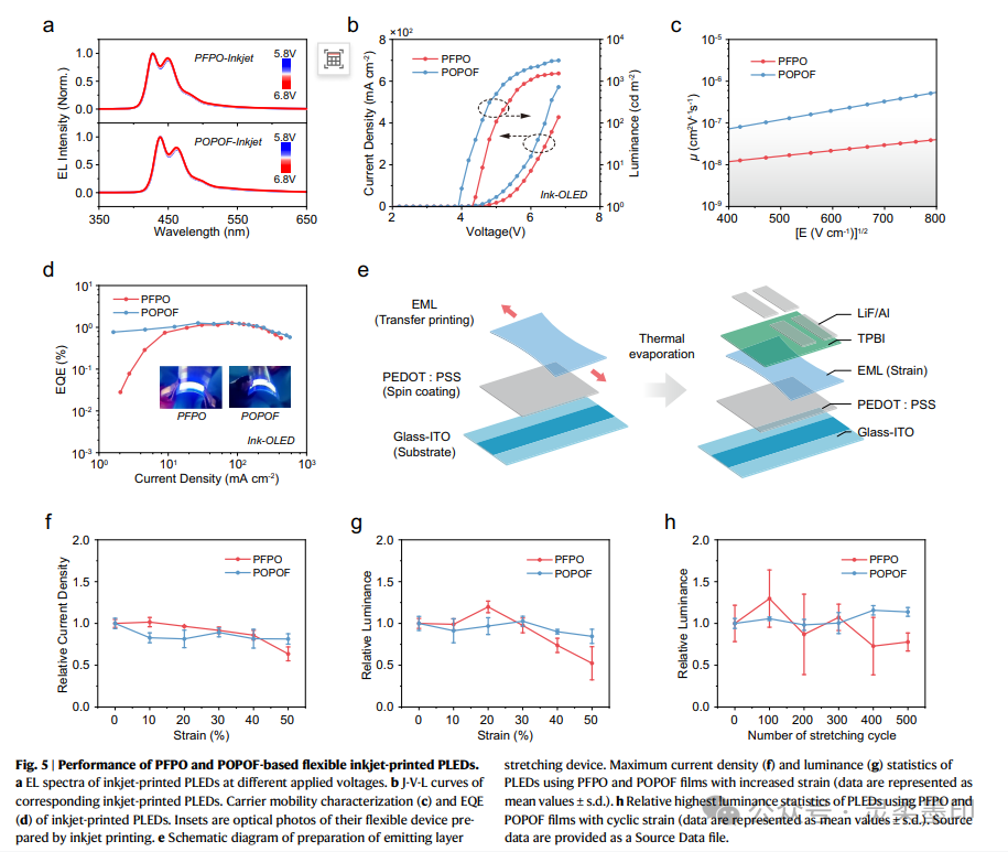 基于 PFPO 和 POPOF 出色的打印性能、发光行为和本征拉伸性,研究人员制备了柔性喷墨打印 PLEDs。器件的电致发光光谱显示出三个特征发射峰,证实了它们稳定的深蓝色发射。POPOF 器件的开启电压更低、亮度更高,这是因为其结构抑制了环状主链的形成,增强了电荷传输能力,使得空穴迁移率更高,外部量子效率和电流效率也更优。值得一提的是,喷墨打印器件的性能可与旋涂器件相媲美。