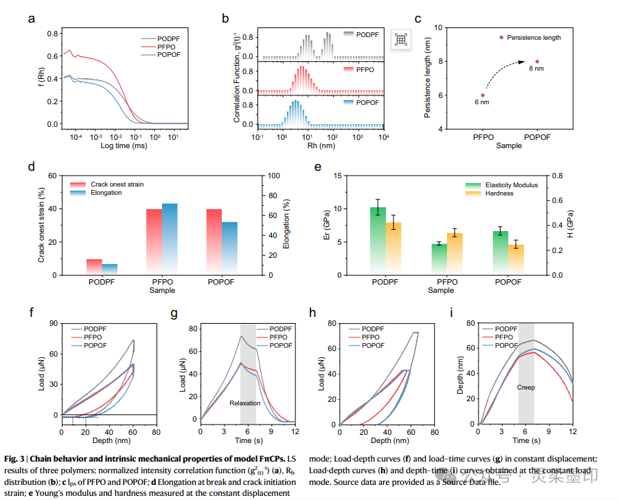 对聚合物薄膜进行机械分析发现,PFPO 和 POPOF 涂层薄膜的裂纹起始应变和断裂伸长率明显高于 PODPF。Nanoindentation 测试表明,PODPF 的模量和硬度大于 PFPO 和 POPOF。在弹性方面,PFPO 最容易回弹,弹性最好;在粘性方面,POPOF 最容易蠕变和松弛,粘性最佳。这表明单侧不对称取代有利于实现薄膜的弹性行为,双侧不对称取代则赋予材料高粘性优势,增强了蠕变和松弛能力。