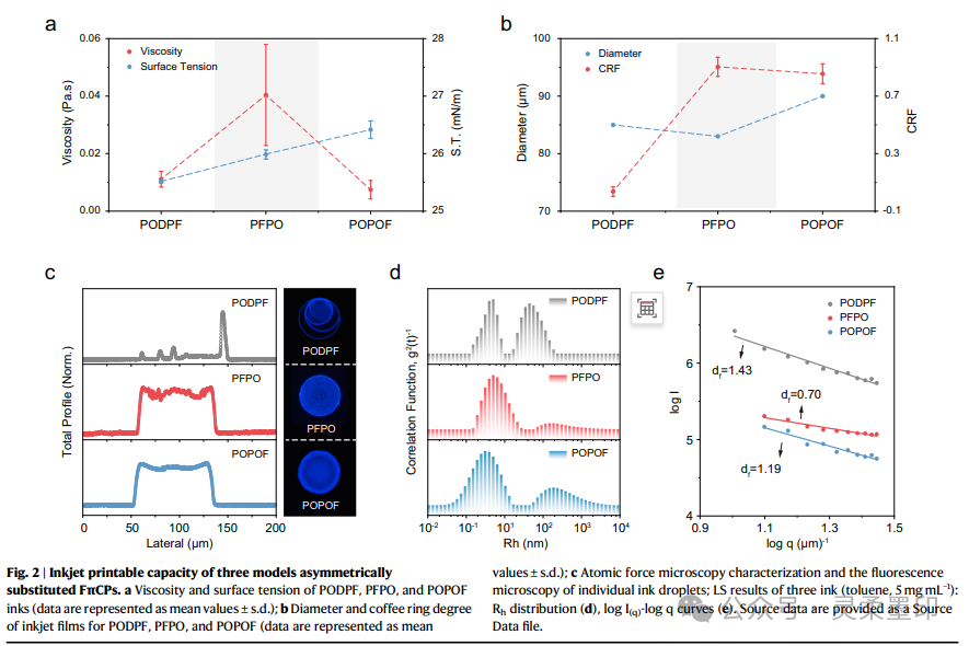 在打印性能方面,研究人员系统地对 PFPO 和 POPOF 的喷墨成膜能力进行了表征。研究发现,三种墨水的粘度均低于 0.05 Pa・s,有利于墨水的稳定喷射和在基板上的铺展;墨水的表面张力随聚合物烷基链比例的增加而增加,适中的表面张力有助于墨滴在空气中悬浮,抑制下落过程中产生的拖尾现象。