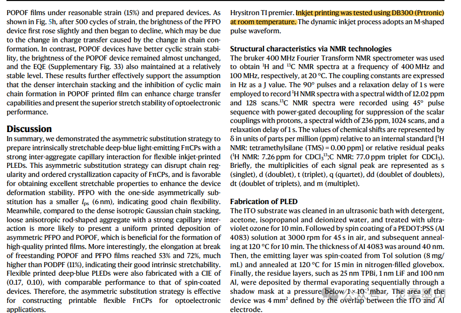 这项研究通过不对称取代策略成功制备了具有强聚集体间毛细管相互作用的本征可拉伸深蓝色发光 FπCPs,用于柔性喷墨打印 PLEDs。这种策略打破了 FπCPs 的链规则性和有序结晶能力,使材料具有出色的拉伸性能,增强了器件的变形稳定性。PFPO 和 POPOF 表现出良好的本征拉伸性,其独立薄膜的断裂伸长率远高于 PODPF。制备的柔性打印深蓝色 PLEDs 的色坐标为 (0.17, 0.10) ,性能与旋涂器件相当。